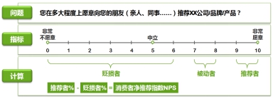 NPS計(jì)算模式:?請用戶回答“您在多大程度上愿意向您的朋友(親人、同事……)推薦XX公司/產(chǎn)品?”根據(jù)用戶的推薦意愿,將用戶分為三類:推薦者(得分在9-10之間)、被動者(得分在7-8之間)、貶損者(得分在0-6之間)。?推薦者與貶損者是對企業(yè)實(shí)際的產(chǎn)品口碑有影響的用戶,推薦者與貶損者用戶在用戶總數(shù)中所占百分比之差,即凈推薦值,如右圖所示。?據(jù)相關(guān)調(diào)查顯示,大部分公司的NPS值在5-10之間。