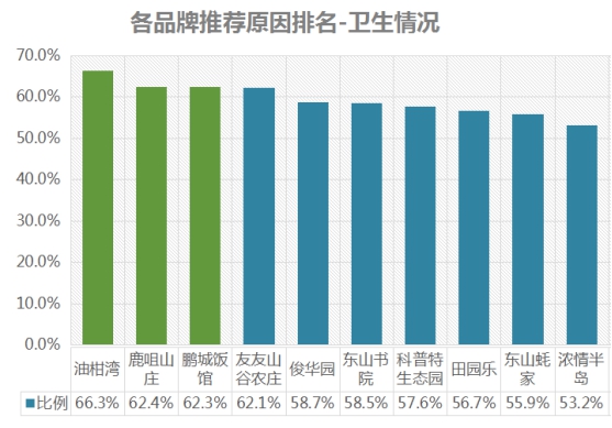 衛(wèi)生情況推薦率排名前三依次為:油柑灣、鹿咀山莊、鵬城飯館;
