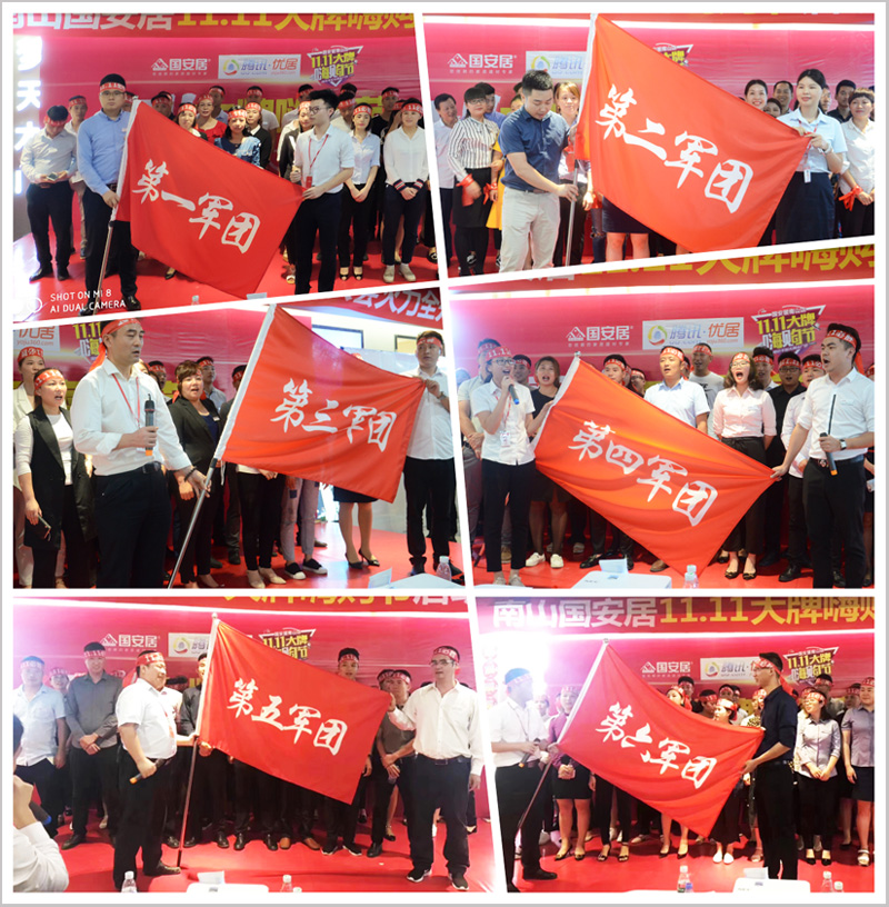 隨后,來自南山店全體方陣隊(duì)員高舉隊(duì)旗,高喊口號(hào),將現(xiàn)場(chǎng)氣氛推向高潮,品牌代表們紛紛上臺(tái)發(fā)言,幾百家建材家具品牌以第一軍團(tuán)、第二軍團(tuán)、第三軍團(tuán)、第四軍團(tuán)、等等團(tuán)隊(duì)方陣,登場(chǎng)亮相,高呼團(tuán)隊(duì)口號(hào),并且當(dāng)場(chǎng)簽署了“雙11大促”的軍令狀,并從商場(chǎng)負(fù)責(zé)人手中接過了“雙11大促”的軍旗,這將預(yù)示著“國(guó)安居南山店&騰訊優(yōu)居雙11大牌嗨購(gòu)節(jié)”定將以卓越的佳績(jī),創(chuàng)造新一輪的銷售盛況!