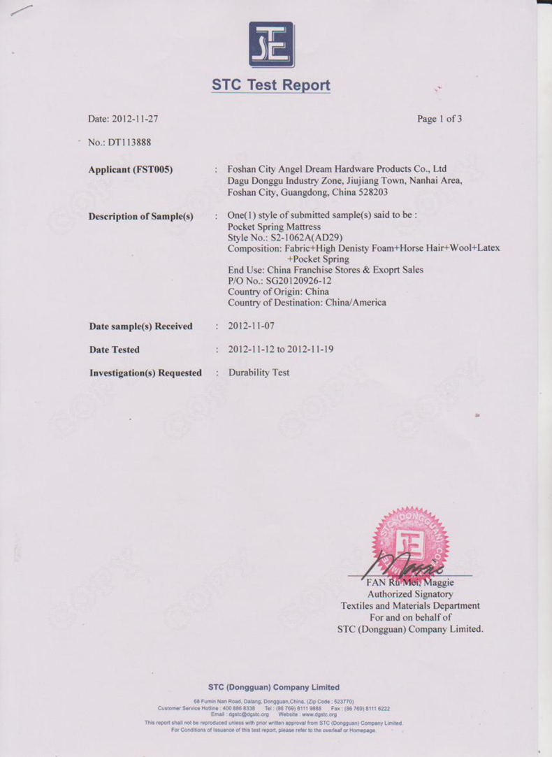 雙重?zé)崽幚砥鸬揭粋€全面消除了彈簧的內(nèi)應(yīng)力,增加抗疲勞強(qiáng)度,提高了彈性極限,使彈簧的彈性、拉力和回彈力更好,床芯不易凹塌變形,彈簧不易折斷。經(jīng)權(quán)威檢測機(jī)構(gòu)STC測試證明:嚴(yán)格按照美標(biāo)ASTM1566耐疲勞測試,西婭圖品牌床墊達(dá)到10萬次連續(xù)錘壓不變形。(吳艷 通訊員/阿東)