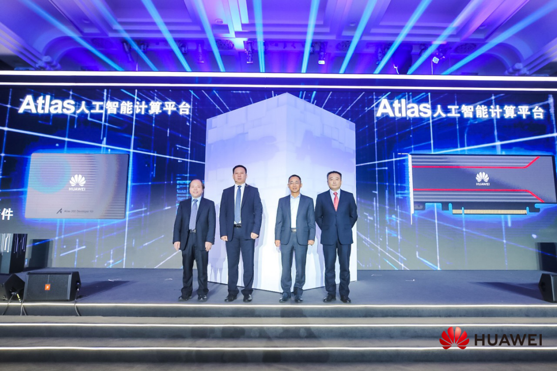 侯金龍、馬海旭和華為中國智能計算業(yè)務(wù)部總裁萬志、華為廣東代表處代表周建軍共同發(fā)布 Atlas產(chǎn)品上市
