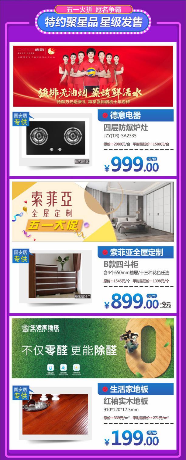 4、冠名聚星品爆款星級(jí)發(fā)售:4月20日-5月4日活動(dòng)期間,國安居精選三大家居大牌火拼五一,星級(jí)巨獻(xiàn)!999元搶德意電器爐灶、899元搶索菲亞全屋定制四斗柜、199元搶生活家實(shí)木地板,限量爆款全城瘋搶,絕對(duì)驚爆眼球。