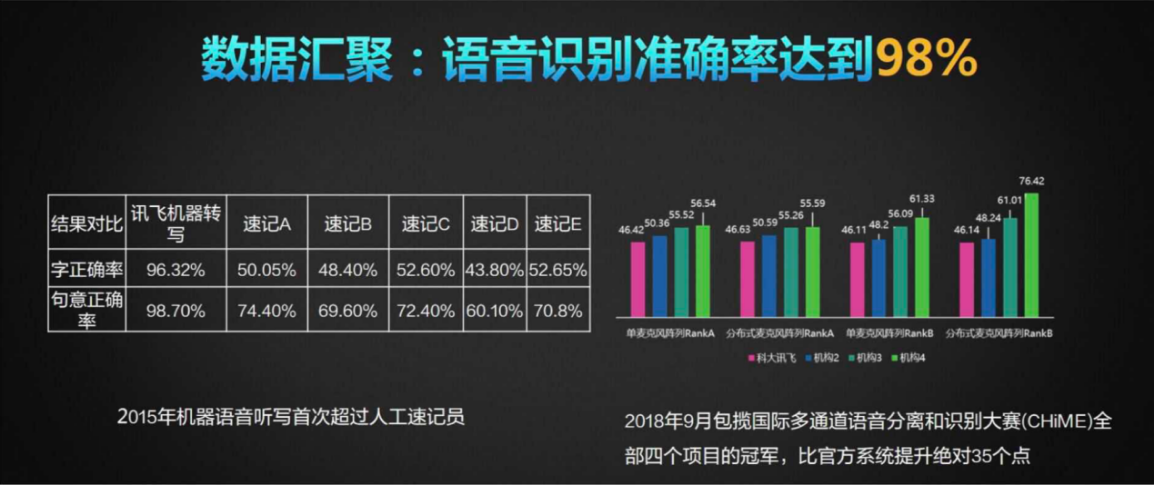 在英文語(yǔ)音識(shí)別、機(jī)器閱讀理解、國(guó)際識(shí)別挑戰(zhàn)賽等多個(gè)A.I.領(lǐng)域的國(guó)際賽事 中,科大訊飛均名列前茅, 至今已獲得12項(xiàng)世界第一。2018年9月,訊飛再次包攬國(guó)際多通道語(yǔ)音分離和識(shí)別大賽(CHiME-5)全部四個(gè)項(xiàng)目的冠軍,該大賽被稱為“史上最難語(yǔ)音識(shí)別任務(wù)”,考察的是在不同場(chǎng)景中自由交談的遠(yuǎn)場(chǎng)語(yǔ)音識(shí)別效果。也再次證實(shí)了訊飛語(yǔ)音識(shí)別在噪音、口音和遠(yuǎn)場(chǎng)識(shí)別挑戰(zhàn)下的絕對(duì)領(lǐng)先優(yōu)勢(shì)。與此同時(shí),訊飛轉(zhuǎn)寫(xiě)引擎于2005年開(kāi)始應(yīng)用服務(wù),期間歷經(jīng)數(shù)次迭代升級(jí)。
