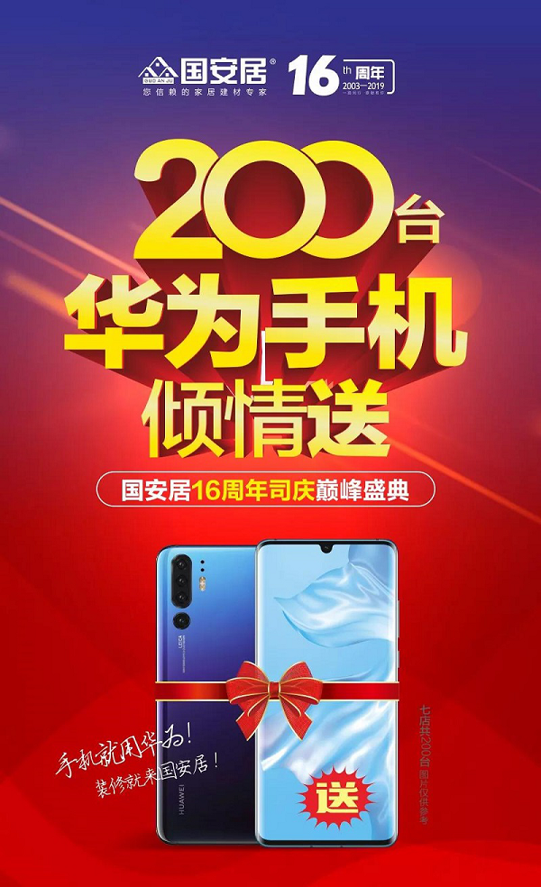 時(shí)光有限,堅(jiān)持無限,國安居16年里始終如一的堅(jiān)持做著一件事情:顧客至上,服務(wù)第一,誠信為本!為回報(bào)廣大家居消費(fèi)者一直的厚愛,國安居深惠七店在此16周年之際,攜手旗下1000余家一線大牌舉行“16周年司慶巔峰盛惠,200臺(tái)華為手機(jī)傾情送”大型促銷活動(dòng)。