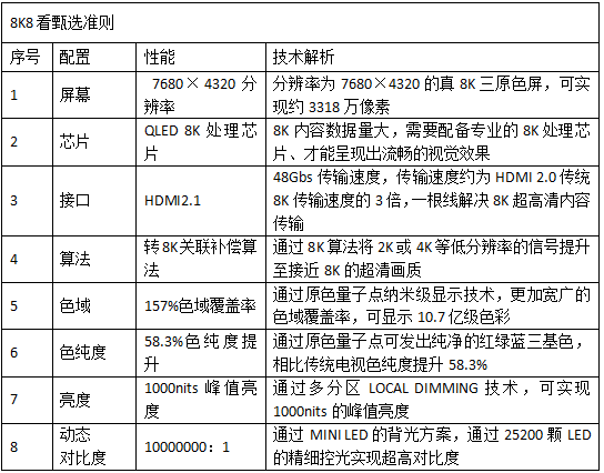 在行業(yè)趨勢及國家政策的雙重推動下,為正確引導(dǎo)8K電視市場發(fā)展方向、加快發(fā)展步伐,TCL聯(lián)合國家廣播電視產(chǎn)品質(zhì)量監(jiān)督檢驗中心經(jīng)過長時間的市場調(diào)研及總結(jié),從行業(yè)整體的角度對8K電視進行了初步探討,并編制出《8K8看甄選白皮書》。這份白皮書告訴我們,實現(xiàn)真正的8K震撼視覺體驗關(guān)鍵性能/技術(shù)要求如下。