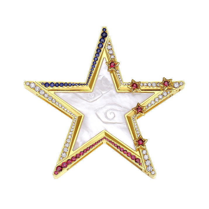 作為本次發(fā)布會(huì)主角,周大福17916系列新品“宸”曾作為第11屆“法國(guó)圣埃蒂安國(guó)際設(shè)計(jì)雙年展”參展作品,在世界舞臺(tái)上綻放過光芒。“五角星”的造型融入了法國(guó)國(guó)旗藍(lán)、白、紅三色和中國(guó)國(guó)旗的五角星元素,代表了中法兩國(guó)的交流與合作,雙方希望通過宸這樣意義深遠(yuǎn)的產(chǎn)品,見證和促進(jìn)兩國(guó)的和平發(fā)展與經(jīng)濟(jì)交流?!板贰币员睒O星為靈感來源,寓意點(diǎn)亮年輕人的生活與夢(mèng)想。別具一格的五角星設(shè)計(jì)藝術(shù)感十足,鉆石與22K金的加持,更讓整個(gè)作品展現(xiàn)出奪目光彩。白貝母項(xiàng)鏈外圈圍以鉆石、寶石,一款三戴,幻化無限魅力。簡(jiǎn)潔的五角星造型,干凈有力,猶如夜空中指引前行的明星。