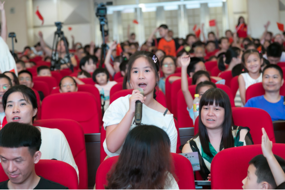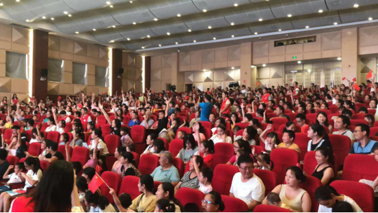 接下來,為進(jìn)一步增強(qiáng)青少年兒童的愛國(guó)意識(shí),主辦方將戲劇教育與愛國(guó)教育有機(jī)融合,于文明知識(shí)問答后,邀請(qǐng)近千名觀眾一起舞動(dòng)小紅旗,齊聲唱響《我和我的祖國(guó)》,點(diǎn)燃了在場(chǎng)每一位觀眾的愛國(guó)熱情,觀眾們跟隨著旋律,共同歌唱祖國(guó),深情祝福祖國(guó)明天更加輝煌。