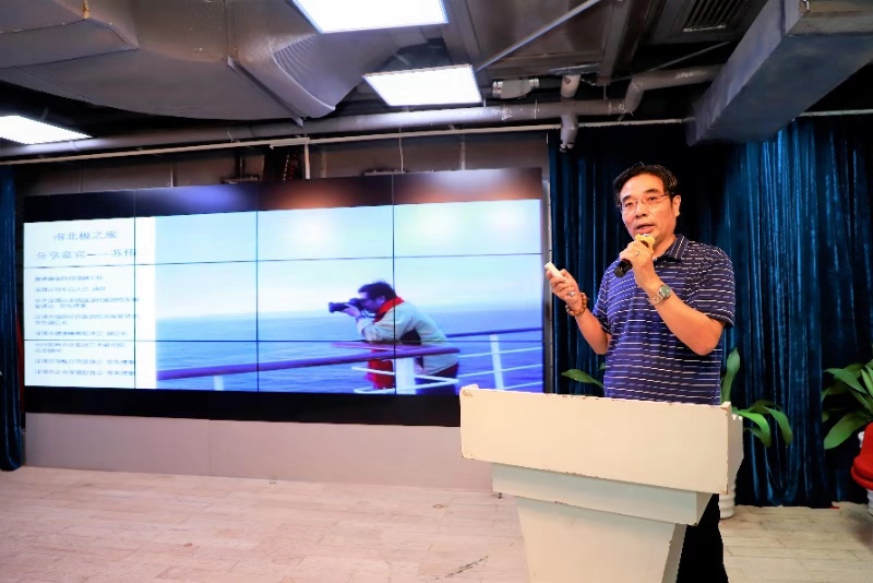 蘇偉老師在現(xiàn)場(chǎng)介紹:10月15日對(duì)深圳來(lái)說(shuō)是一個(gè)極其不平凡的日子,上午在深圳舉辦了首屆“中國(guó)海洋第一展”暨“2019中國(guó)海洋經(jīng)濟(jì)博覽會(huì)”在深圳會(huì)展中心隆重開幕,下午由中國(guó)自主建造的首艘極地科學(xué)考察破冰船“雪龍2”號(hào)在蛇口港出發(fā)首航挺進(jìn)南極,特別機(jī)緣巧合的是我今晚分享的內(nèi)容就是南北極旅游。為什么用“畫”極地,而不是“話”極地,這是因?yàn)?,地球有三極,除了南北極外,還有“珠峰”就是第三極。而我們?nèi)齻€(gè)六十年的老男人,在蘇偉老師的鼓動(dòng)下,三個(gè)人用不到三年的時(shí)間,踏訪了這“三極”。如果要展開講,恐怕三天三夜也講不完。所以,“畫”極地,就是用照片,講一下照片背后的故事。