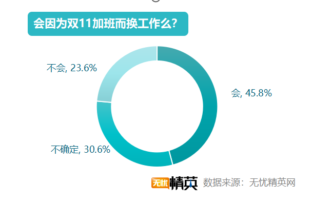 雙11過于辛苦,不少人會(huì)有工作上逃離雙11的想法。45.8%的職場精英因?yàn)殡p11加班過多,會(huì)有換工作的想法,不過,較2018年50.6 %的人有這種想法,已有所下降;30.6%的精英不確定要不要換工作,23.6%的職場精英則表示不會(huì)因?yàn)殡p11加班多而換工作。