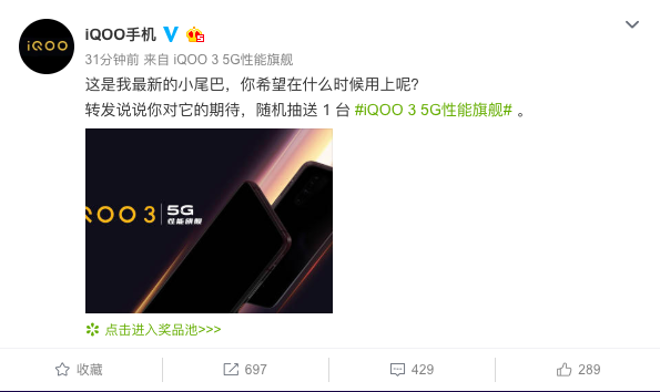 不僅如此,iQOO官博還在近期發(fā)布了一條“ UFS3.1用起來真快,二月見哦!”的微博,進一步肯定了iQOO3的即將到來,并將搭載UFS3.1頂級閃存芯片的事實。這是繼iQOO Neo855版采用UFS3.0閃存領(lǐng)先業(yè)界后的再次升級,進一步提升和鞏固了iQOO3的5G性能旗艦定位。