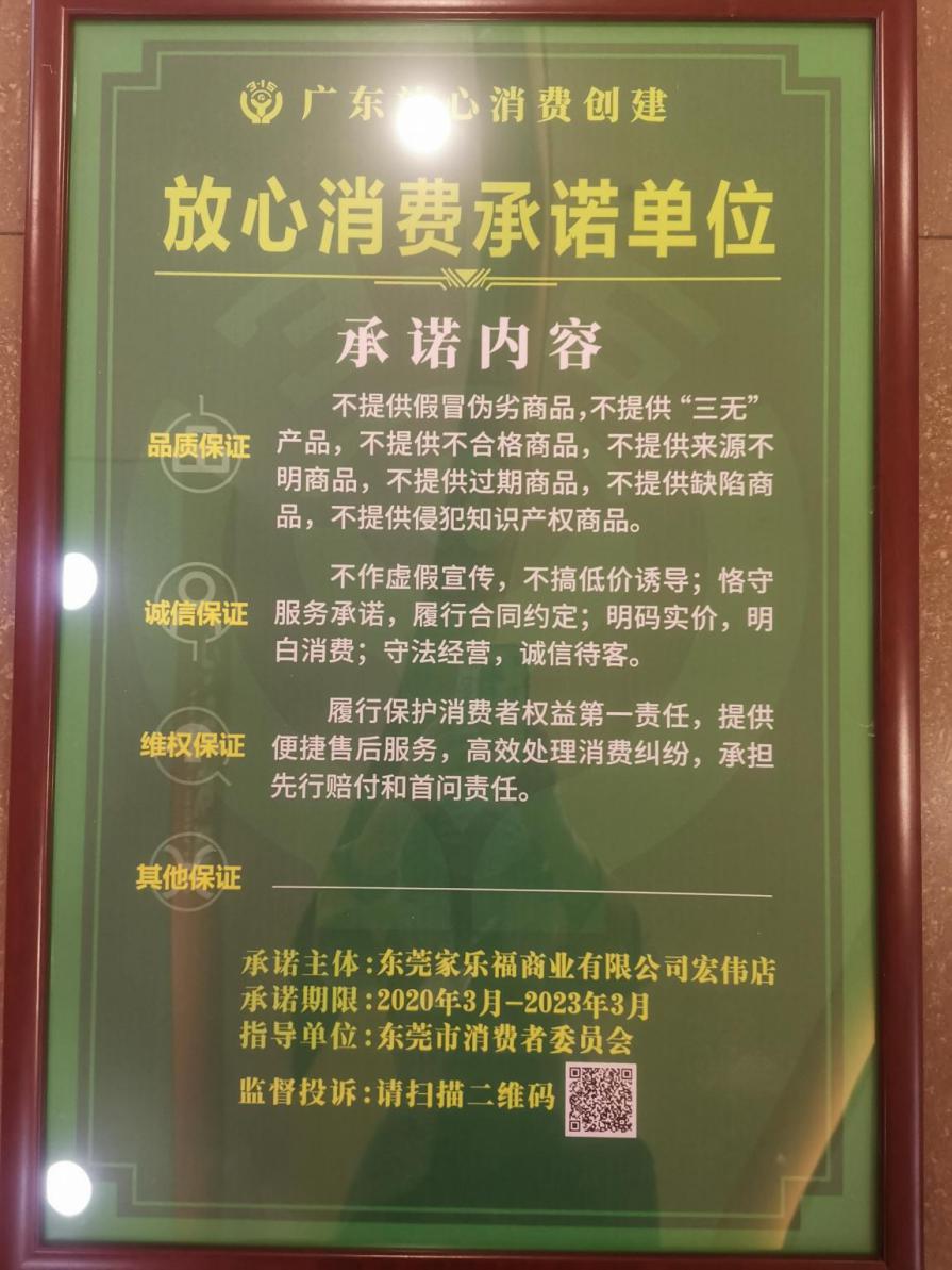 家樂福根據(jù)《經(jīng)營者“放心消費承諾”活動規(guī)則(試行)》向社會公開作出品質(zhì)保證、誠信保證和維權(quán)保證的“三大承諾”,承諾不提供假冒偽劣商品,不提供“三無”產(chǎn)品;不作虛假宣傳;履行保護(hù)消費者權(quán)益第一責(zé)任等,充分發(fā)揮放心消費承諾單位示范作用,深入推進(jìn)放心消費創(chuàng)建活動,深化消費維權(quán)社會協(xié)同共治,營造安全放心的消費環(huán)境。