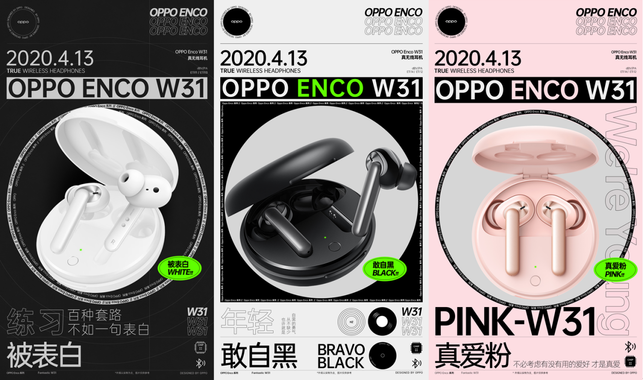 OPPO Enco W31真無線耳機(jī)將極簡設(shè)計(jì)美學(xué)與前沿科技完美糅合,化身潮流好物。遵循簡約小巧的設(shè)計(jì)理念,外殼圓潤輕巧,方便用戶隨身攜帶。擁有敢自黑、被表白、真愛粉三種配色可供選擇,滿足年輕人不同個性的表達(dá)。