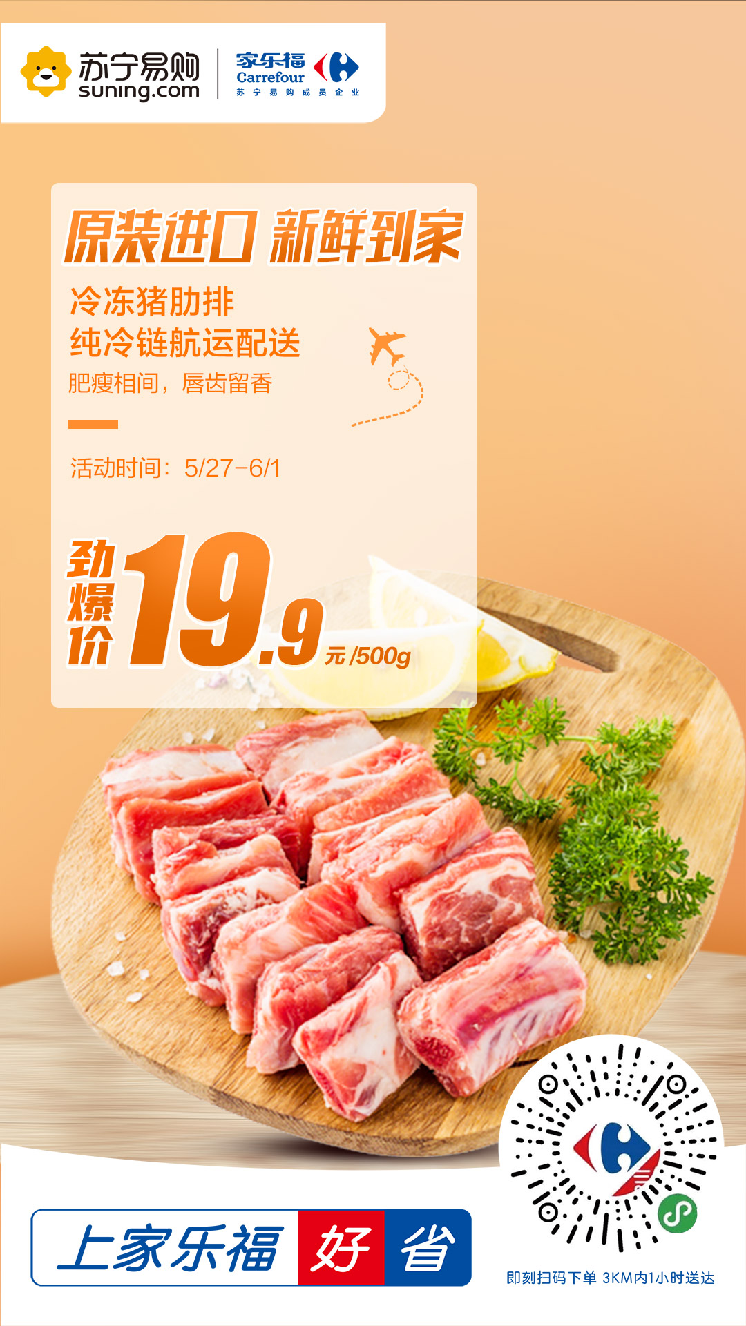 進口冷凍豬肋排是本次活動的主推爆品之一。生豬按照歐盟標準養(yǎng)殖,采用非轉(zhuǎn)基因飼料喂養(yǎng),全程不使用抗生素,原廠精切,采用純冷鏈航運配送,全程可溯源。肥瘦相間,讓人唇齒留香。豬肉價格高企的背景下,這款進口豬肋排原價39.9元/500g,活動期間僅售19.9元/500g,價格十分惠民,絕對是秒殺爆品。此外,家樂福還準備了澳洲黃牛肉36.8元/斤、帶皮后腿肉19.9元/斤、小龍蝦19.9元/盒、波士頓龍蝦+三文魚的組合預售。誠意滿滿,只為滿足“食肉獸”的大胃口!