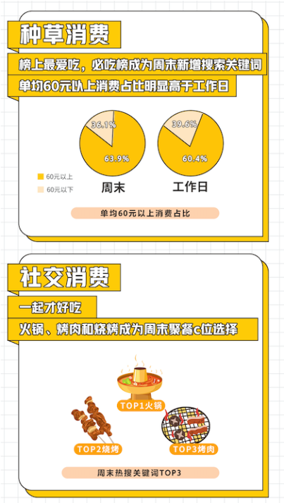 跟著榜單種草、拔草的“種草消費”成為周末消費的重要特點之一。美團6-7月數(shù)據(jù)顯示,“必吃榜”成為周末新增熱搜關鍵詞,且6-7月周末單均60元以上消費占比達63.9%,明顯高于工作日的60.4%。