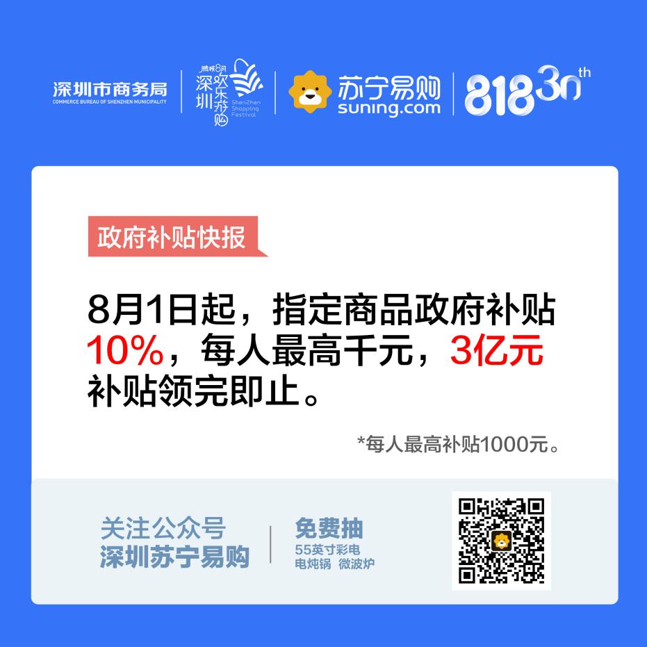 第二屆鵬城八月歡樂游購——深圳家電數(shù)碼消費(fèi)節(jié)在華強(qiáng)北群星廣場自8月1日起拉開帷幕,已向深圳居民推出3億元家電和數(shù)碼產(chǎn)品補(bǔ)貼政策,用戶按實(shí)際購買價(jià)格的10%給予補(bǔ)貼,每位居民累計(jì)最高補(bǔ)貼1000元?;浉厶K寧電器店及家樂福與大潤發(fā)近3000件商品均可享用。品類覆蓋齊全,商品選擇范圍廣,為消費(fèi)者帶來一場盛大家電數(shù)碼消費(fèi)節(jié)的同時(shí)為經(jīng)濟(jì)消費(fèi)做出強(qiáng)有力的貢獻(xiàn)。