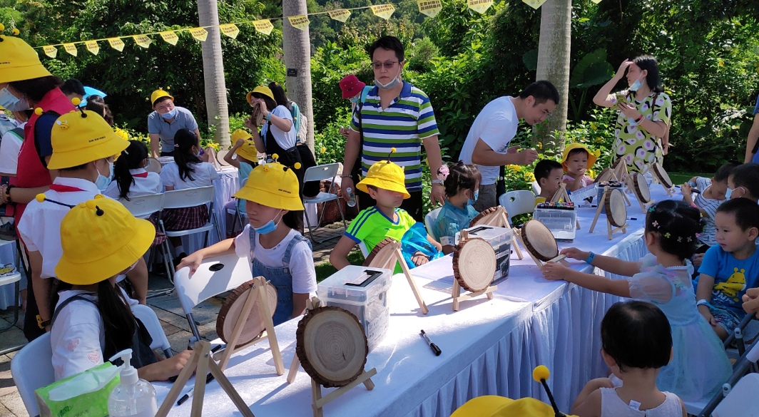 在自然課堂,分為科普展覽區(qū)、繪畫活動區(qū)和蜂產(chǎn)品體驗區(qū),孩子們戴著黃色的卡通帽子,像一只只勤勞的小蜜蜂忙碌地參與各項活動。在科普展板前,他們認真記錄蜜蜂的基本知識、品質(zhì)精神,了解蜜蜂與人類的關(guān)系、保護生物多樣性的重要性,家長們結(jié)合展板耐心講解《深圳經(jīng)濟特區(qū)科學技術(shù)普及條例》、全國科普日、深圳科普月等知識。