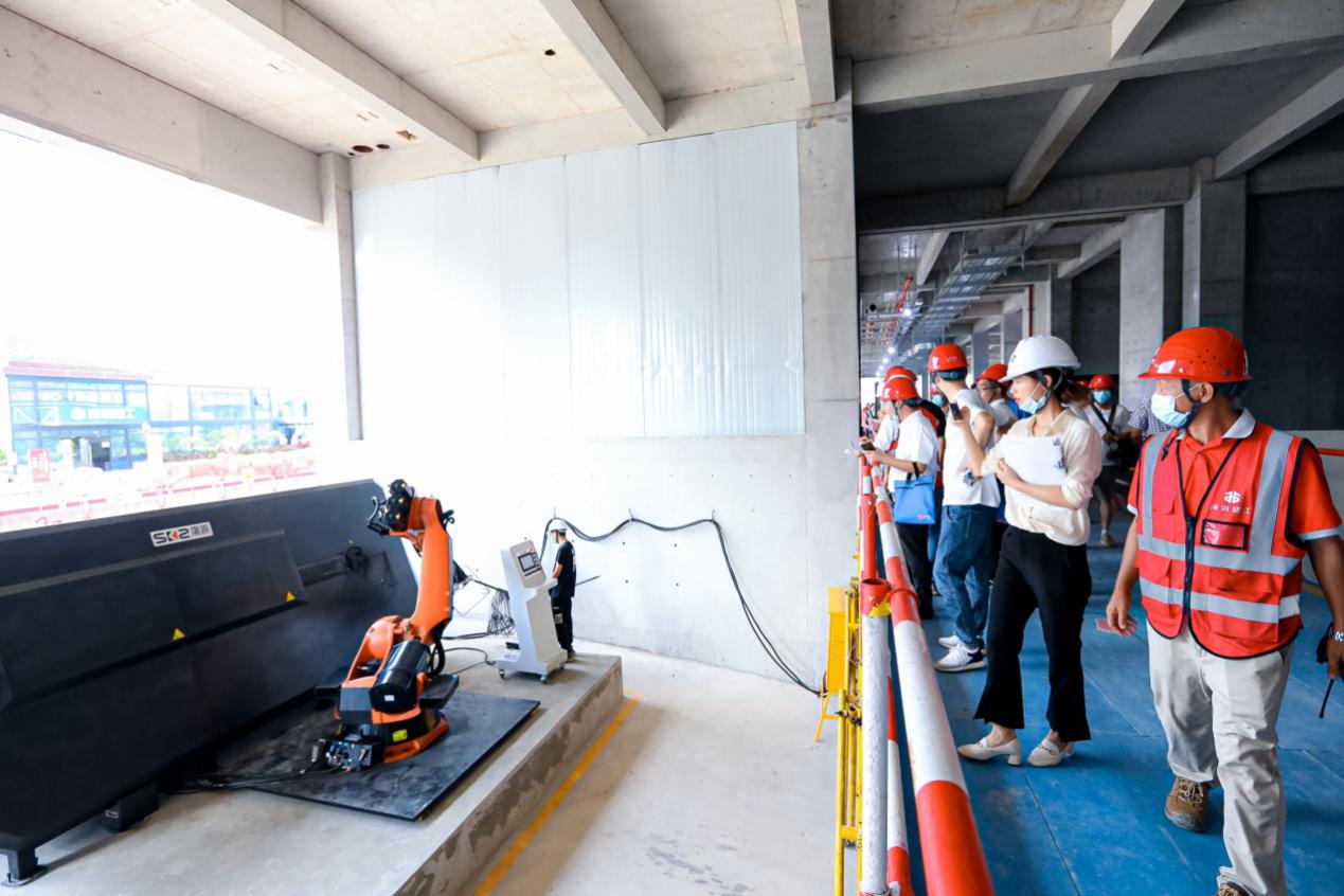 此次觀摩由“三中心一展區(qū)”構(gòu)成,即創(chuàng)魯班獎優(yōu)秀工藝展示中心、科技創(chuàng)新中心、智能指揮中心和建筑內(nèi)展區(qū)。觀摩主要亮點有黨建引領高質(zhì)量發(fā)展、質(zhì)量管理體系與機制(參建方質(zhì)量管理體系、6σ管理、質(zhì)量管理標準化、精細化)、創(chuàng)魯班獎優(yōu)秀工藝展示、市工務署優(yōu)秀工藝工法展示、工程質(zhì)量常見問題治理(樣板引路)、智能建造推動質(zhì)量提升(科技創(chuàng)新展示、抹灰機器人、實測實量機器人等智能建造設備實操演示、BIM技術(shù))、智慧工地展示(“e工務”APP應用與推廣、智慧工地、智能指揮等)、6S管理等,通過現(xiàn)場講解員的介紹,使觀摩人員更加清晰且深入的了解相關(guān)內(nèi)容。
