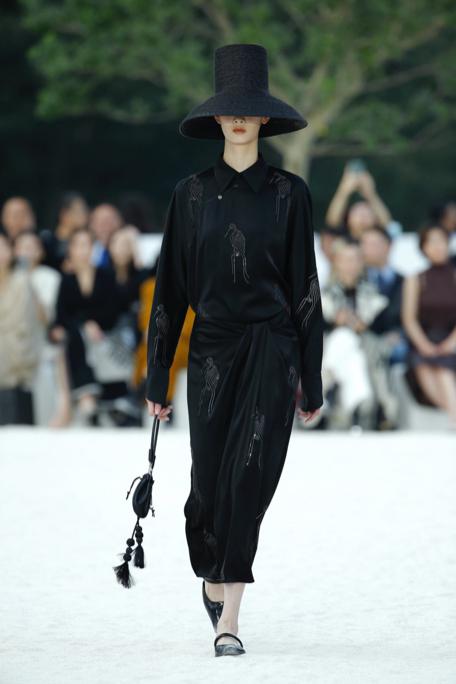 隨著試衣到家直播間的鏡頭走進(jìn)3D水月長(zhǎng)廊,以荷塘月色展開(kāi)靈動(dòng)畫(huà)幅,移步換景,景隨心動(dòng),科技與時(shí)裝碰撞,呈現(xiàn)唯美而純粹的東方意境。整個(gè)空間給你的視覺(jué)、聽(tīng)覺(jué)和嗅覺(jué),帶來(lái)沉浸式的美的體驗(yàn)?!胳o謐之境」的秀場(chǎng)是一片米白色的沙地,曲線的秀凳宛如潺潺流水。一棵鐵冬青,代表靜謐生長(zhǎng)的力量??臻g留白是當(dāng)代的表現(xiàn)手法,秀場(chǎng)的設(shè)計(jì)延續(xù)了ZHUCHONGYUN每一季服裝的主色系——米白色和黑色,符合東方人內(nèi)斂、安靜的氣質(zhì)。