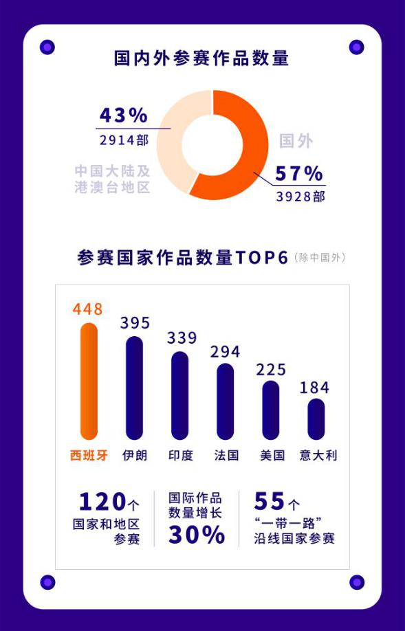 自今年9月中旬全球短片征集啟動以來,本屆短片節(jié)獲得來自世界各地創(chuàng)作者的積極響應(yīng),盡管受到新冠疫情影響以及遭遇影視產(chǎn)業(yè)寒冬,但本屆短片節(jié)參賽作品數(shù)量卻逆勢而上,并刷新歷史新高。而且,在今年的6842部參賽作品中,國際參賽作品多達(dá)3928部,數(shù)量較去年增長30%,占作品總量的57%。在今年參賽的120個國家和地區(qū)中,作品數(shù)量位居前六名的國家分別是西班牙(448部)、伊朗(395部)、印度(339部)、法國(294部)、美國(225部)和意大利(184部)。值得一提的是,作為深圳市參與“一帶一路”建設(shè)重點(diǎn)項目,短片節(jié)今年吸引了來自“一帶一路”沿線的55個國家參賽,約占目前65個“一帶一路”沿線國家數(shù)的85%,短片節(jié)作為推動“一帶一路”沿線國家間人文交流、促進(jìn)全球跨文化傳播的重要平臺的作用日益凸顯,國際化進(jìn)一步走向深入。