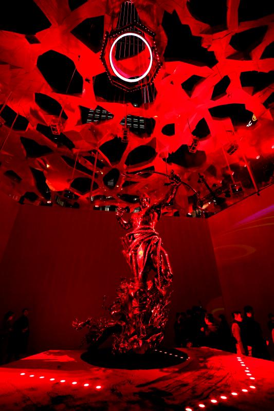 大型沉浸式藝術(shù)裝置“赤子心”橫跨了平安金融中心商場九至十層平臺,總占地面積近四千平方米。在展出十五件大型雕塑作品的同時(shí),將光影藝術(shù)與聲音藝術(shù)巧妙融合,串聯(lián)起虛擬影像與現(xiàn)實(shí)空間,以闡釋純粹、無畏的赤子之心?!俺嘧有摹笔褂^眾走入藝術(shù)品內(nèi)部、探索藝術(shù)家的內(nèi)心深處,通過親身參與展覽并與之對話,從而理解“其大無外,其小無內(nèi),世界即內(nèi)心投射”的本質(zhì)。
