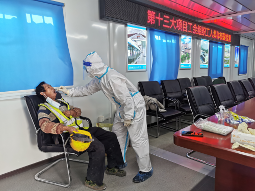 “項目部把核酸檢測的工作人員請到施工現(xiàn)場幫我們做采樣,既方便又安全,還不耽誤干活,真的太暖心了,防控疫情,排查隱患,我們也不能拖后腿?!爆F(xiàn)場工人說道。檢測前項目開展了測溫登記工作,確保每個工人檔案完整。檢測期間,在項目管理人員的組織下,工人們有序排隊、保持安全距離、領(lǐng)取檢測盒,工人在等候區(qū)戴好口罩,并間隔1米排隊。此次共計400余位勞務工人順利完成了核酸檢測。檢測過程中,項目部宣貫了防疫知識,提醒工友們在工作和生活上的防疫注意事項。