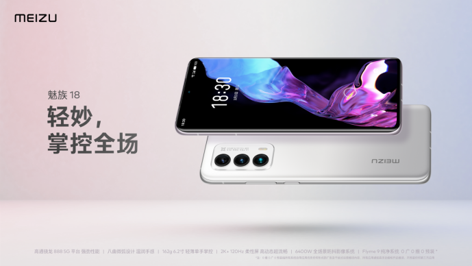 魅族18是一款“非典型卻魅族式”的小屏滿血旗艦,雖是輕薄卻不失旗艦性能。驍龍888旗艦處理平臺(tái)、UFS3.1疾速閃存、LPDDR5滿血內(nèi)存等超旗艦配置一應(yīng)俱全,性能之強(qiáng)大或許會(huì)讓用戶忘記了魅族18是一款重量?jī)H162g、厚度僅為8.18mm的輕薄手機(jī)。