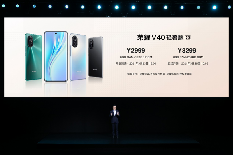 榮耀V40輕奢版擁有幻夜黑、藍水翡翠和鈦空銀三種配色,提供8GB+128GB、8GB+256GB兩個內(nèi)存版本,售價分別為2999元和3299元。3月26日10:08在線上線下全平臺開售,用戶可通過榮耀商城及各大授權電商平臺或前往榮耀線下體驗店、榮耀授權零售門店進行購買。