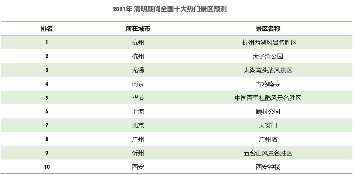 預計清明假期杭州西湖風景名勝區(qū)最為熱門,其次為太子灣公園、太湖黿頭渚風景區(qū)、古雞鳴寺、中國百里杜鵑風景名勝區(qū)、顧村公園、天安門、廣州塔、五臺山風景名勝區(qū)、西安鐘樓。