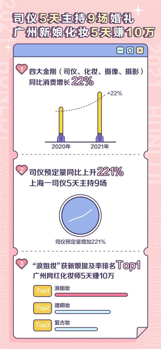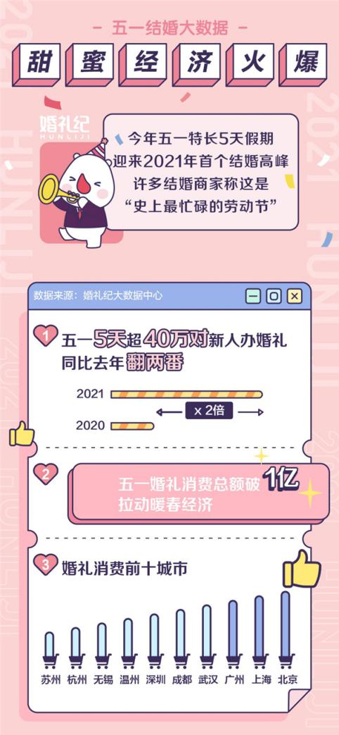 數(shù)據(jù)顯示,五一迎來2021年首個(gè)結(jié)婚高峰,5天內(nèi)超40萬對新人舉辦婚禮,同比去年翻兩番。五一婚禮消費(fèi)總額破1億,在一定程度上拉動(dòng)暖春經(jīng)濟(jì)?;槎Y消費(fèi)前十城市分別是北京、上海、廣州、武漢、成都、深圳、溫州、無錫、杭州、蘇州。