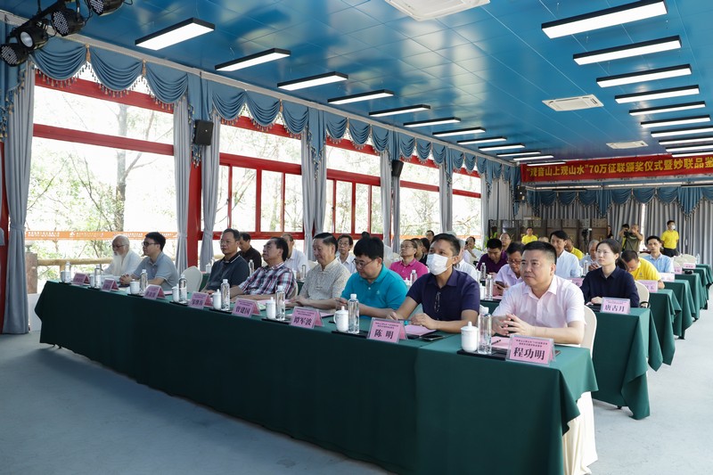 見圳客戶端·深圳新聞網(wǎng)2021年5月18日訊(記者 常軍平)“觀音山上觀山水”70萬征聯(lián)活動(dòng)終有結(jié)果,評(píng)選出15句優(yōu)秀下聯(lián),最佳下聯(lián)空缺,并于5月17日在東莞觀音山舉行了頒獎(jiǎng)儀式及妙聯(lián)品鑒座談會(huì)?;顒?dòng)現(xiàn)場(chǎng),楹聯(lián)家們雅聚一堂,共同見證了本次征聯(lián)活動(dòng)優(yōu)秀獎(jiǎng)的頒出。以楹聯(lián)為媒,進(jìn)行交流互動(dòng)?;顒?dòng)期間,組委會(huì)代表東莞觀音山將結(jié)余款項(xiàng)67萬元悉數(shù)捐給東莞樟木頭鎮(zhèn)慈善會(huì)。鑒于觀音山在推動(dòng)楹聯(lián)文化的傳承發(fā)展做出的突出貢獻(xiàn),被中國(guó)楹聯(lián)學(xué)會(huì)授予“中國(guó)楹聯(lián)文化名山”稱號(hào)。