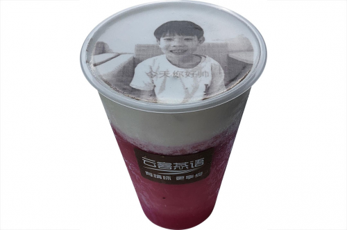 建議由孩子把自己或家人的照片加上一句話祝愿的話,作成圖片先保存到手機(jī)里。到店后,在云客茶語小程序上傳打印到奶茶上。整個(gè)制作過程約10分鐘。
