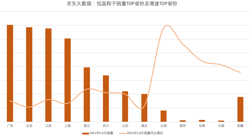 與低溫發(fā)展趨同的,還有平臺(tái)助力食品企業(yè)數(shù)字化和渠道完善帶來的整個(gè)行業(yè)對(duì)下沉市場(chǎng)的發(fā)掘——從銷量看北京、廣東及江浙滬等發(fā)達(dá)地區(qū)是低溫粽子的主要消費(fèi)區(qū)域,四川、山東、湖北等省緊隨其后。而隨著京東冷鏈和物流的下沉和完善,山西、貴州、甘肅、云南、安徽等省區(qū)的增速位列全國前五。
