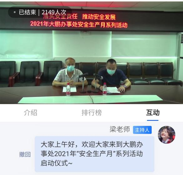 近日,大鵬辦事處組織開展了安全生產(chǎn)月系列活動(dòng),因疫情防控需要,此次啟動(dòng)儀式采取線上直播的方式進(jìn)行,轄區(qū)2100余名居民熱情參與“走進(jìn)”會(huì)議現(xiàn)場,參與答題人數(shù)1750人,活動(dòng)共計(jì)派發(fā)紅包635份。