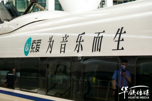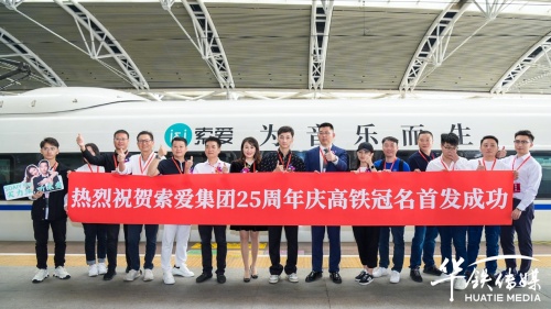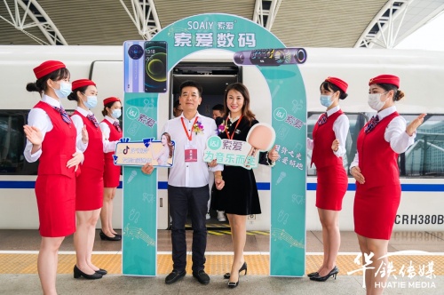 10月28日上午,索愛集團(tuán)董事長劉建佳、總經(jīng)理全雪梅、華鐵傳媒集團(tuán)廣州分公司銷售總經(jīng)理劉延群等領(lǐng)導(dǎo)嘉賓共同為冠名發(fā)車儀式揭幕、剪彩、互贈(zèng)紀(jì)念禮品,在現(xiàn)場嘉賓的共同見證下,張貼索愛全新品牌代言人陳小春夫婦形象宣傳海報(bào)的“索愛-為音樂而生”高鐵冠名列車正式啟程。