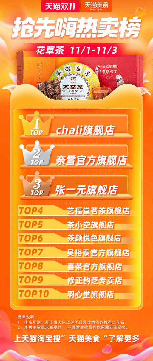 今年“雙11”電商購物節(jié)比往年更早開啟,10月20日晚8點(diǎn)便拉開序幕,奈雪的茶隨之推出滿減、秒殺等多項(xiàng)優(yōu)惠活動(dòng)。奈雪此次雙11迎來開門紅,數(shù)據(jù)顯示,11月1日凌晨開售后僅10分鐘,奈雪的茶的銷售總額便突破去年全天。11月1日-3日,伴隨著茶禮盒等產(chǎn)品的熱銷,奈雪躋身花草茶銷售額排行榜TOP2。