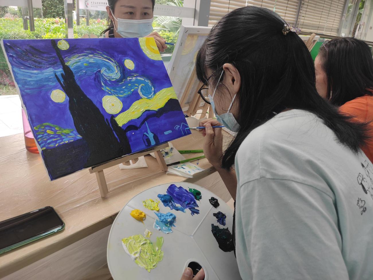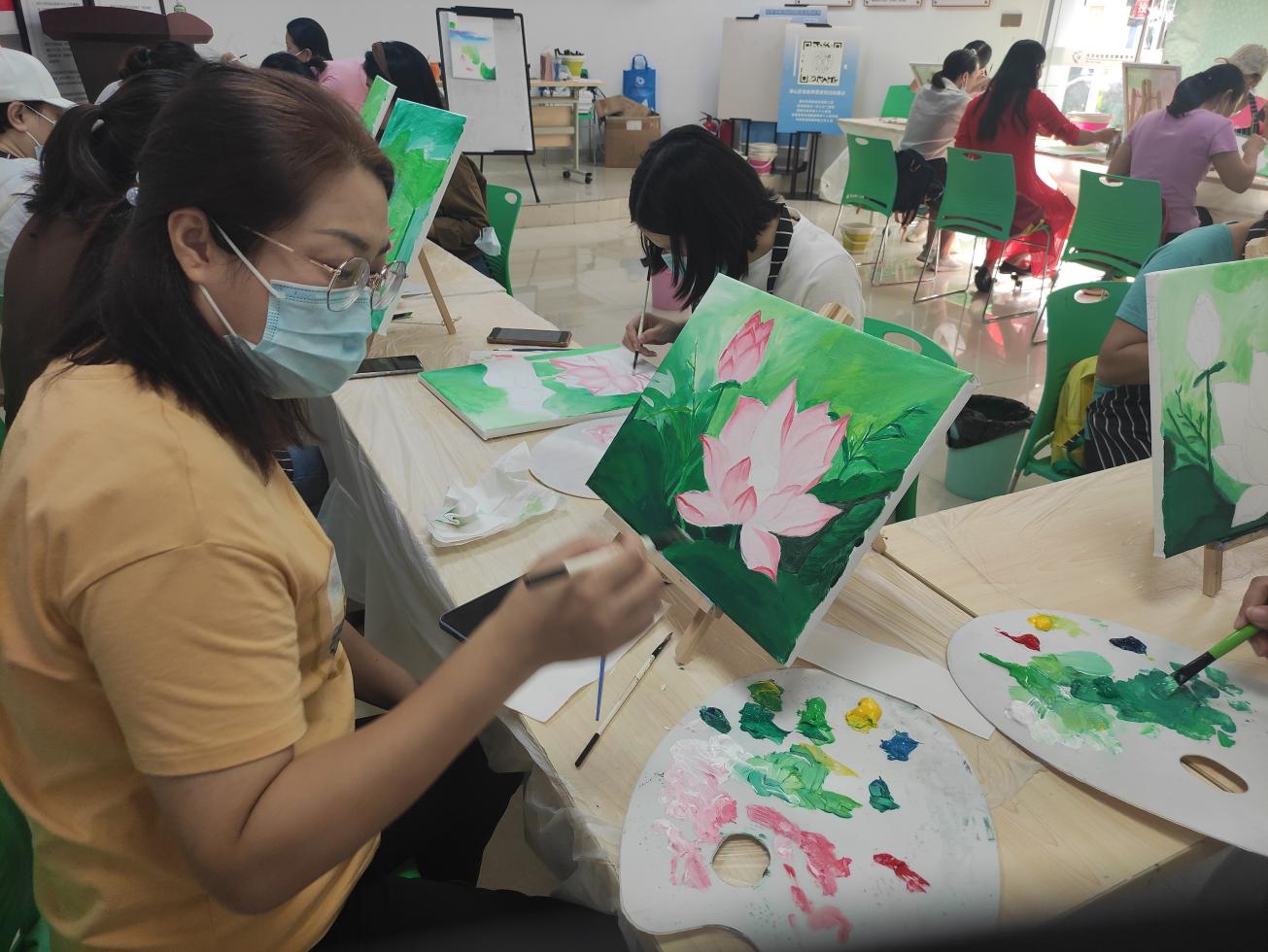 全職媽媽,這個平凡而偉大的群體,操持家務(wù)、陪伴孩子、全年無休,為此犧牲了自己的興趣愛好,交際圈、經(jīng)濟(jì)收入。大汪山社區(qū)關(guān)注媽媽身心健康,以“油畫”搭建平臺,為全職媽媽們創(chuàng)造減壓、專注、有趣的“個人時間”。在這里,媽媽們暫時放下孩子的作業(yè)、未洗的衣服、未做的晚飯,專注于和畫筆、顏料、畫友相處的時間:油畫基礎(chǔ)、畫面結(jié)構(gòu)、色彩調(diào)配、色彩層次……