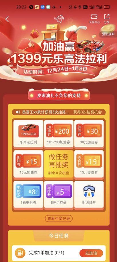 此外,“歲末油禮 ·油衷感謝”活動(dòng)期間,用戶(hù)在體驗(yàn)高德加油不下車(chē)服務(wù)便利的同時(shí),還可以參加樂(lè)高玩具、201 -200免減等新年禮物的抽獎(jiǎng),大獎(jiǎng)天天有。