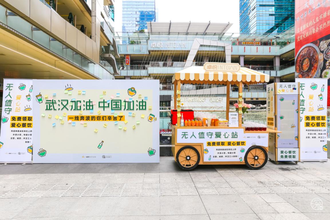 3月3日至3月8日卓悅INTOWN在街頭專設(shè)了一個(gè)”無(wú)人值守愛心站”,用愛心餐車上放滿了食物冷/熱飲,專門免費(fèi)贈(zèng)送給快遞、外賣小哥、環(huán)衛(wèi)工人、警察、城管等一線奔波的人員。