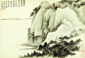 吳湖帆在所藏米芾《多景樓詩帖》冊首補(bǔ)繪的《北固山江山圖》(局部)