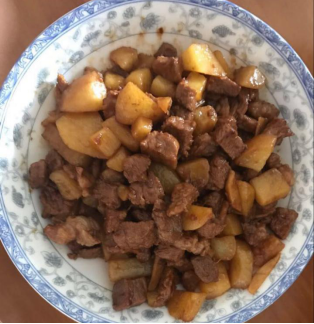 我們準備好食材:梅頭肉、土豆、生抽和老抽、姜、少量白砂糖和油。媽媽把梅頭肉在水里煮了一下。這個時候,我也沒閑著,我拿出幾個土豆,洗好,再用刨子小心翼翼地把皮削干凈。我和媽媽一起把梅頭肉和土豆切塊,把姜切細,就準備下鍋了。媽媽先倒一點油到鍋里,鍋熱后把姜放進去。接下來是切好的梅頭肉,將肉燒的泛黃后倒入土豆,然后是生抽和老抽各一小勺,還要放入少量的白砂糖,最后用水剛好沒過食材。先大火后中火再轉(zhuǎn)小火燜大約三十分鐘,收汁,出鍋!