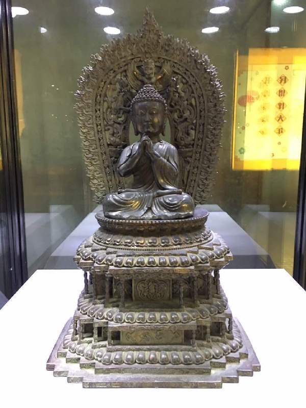 繼上個月舉辦的第一季“民國瓷畫展”,目前正在展覽的是第二季“佛像藝術(shù)展”。展出了遼金時期的銀鎏金佛塔、宋代泥塑描金的書卷觀音像、唐代捶揲銀鎏金“佛說金色王經(jīng)”上下卷,還有南北朝時期的石雕彩漆描金思維菩薩像,這一期展出了29件展品。