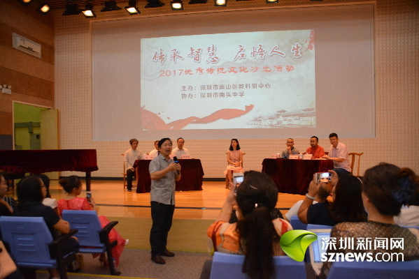 深圳新聞網(wǎng)訊(記者 楊渝嘉)為了探索如何傳承中華優(yōu)秀傳統(tǒng)文化,6月1日,南山區(qū)教育局2017年傳統(tǒng)文化節(jié)系列活動(dòng)的收官之作——國學(xué)沙龍?jiān)诎倌昀闲D项^中學(xué)國學(xué)教室舉行。南山區(qū)教育科學(xué)研究中心主任余耀賢、南山區(qū)各中小學(xué)校的名師以及眾多國學(xué)愛好者們參加了本次活動(dòng),在活動(dòng)中暢所欲言,共同探討國學(xué)的意義和發(fā)展前景。