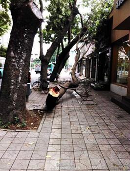 然而行道樹(shù)的不當(dāng)種植與生長(zhǎng)也會(huì)帶來(lái)許多危害。行道樹(shù)傾斜生長(zhǎng)極易造成樹(shù)木倒伏,倒伏后造成倒壓占道的同時(shí)也存在巨大的安全隱患。且行道樹(shù)龐大的樹(shù)根也會(huì)存在破壞人行道及盲道的現(xiàn)象,造成路面不平,部分傾倒的樹(shù)木還易引發(fā)斷電和漏電等問(wèn)題,給市民生活帶來(lái)不便。