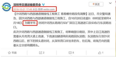 據(jù)市交委于2016年10月21日發(fā)布的通告稱,沙河西路與西部通道側(cè)接線工程(即東濱路隧道匝道工程)的施工時間計劃為2016年10月20日凌晨0:00時起至2017年4月18日,為期半年。期間將封閉沙河西從路南行s3廣深沿江高速進口及s3東行東濱路出口。