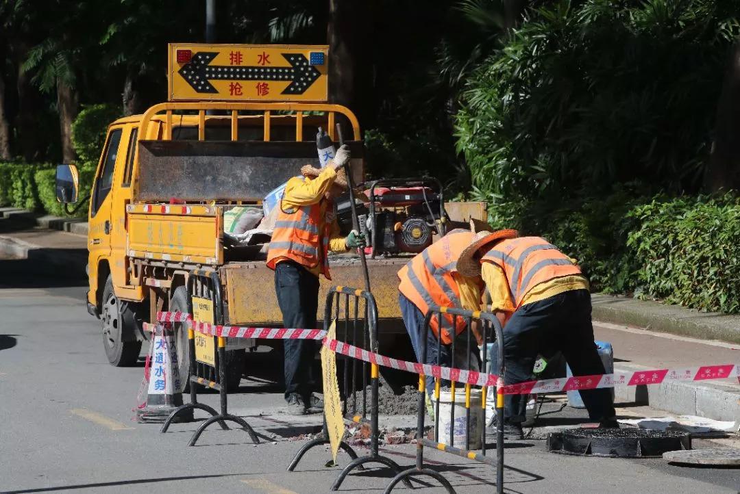 水務(wù)部門工作人員在瀾景路上對(duì)路面的破損井蓋進(jìn)行更換。
