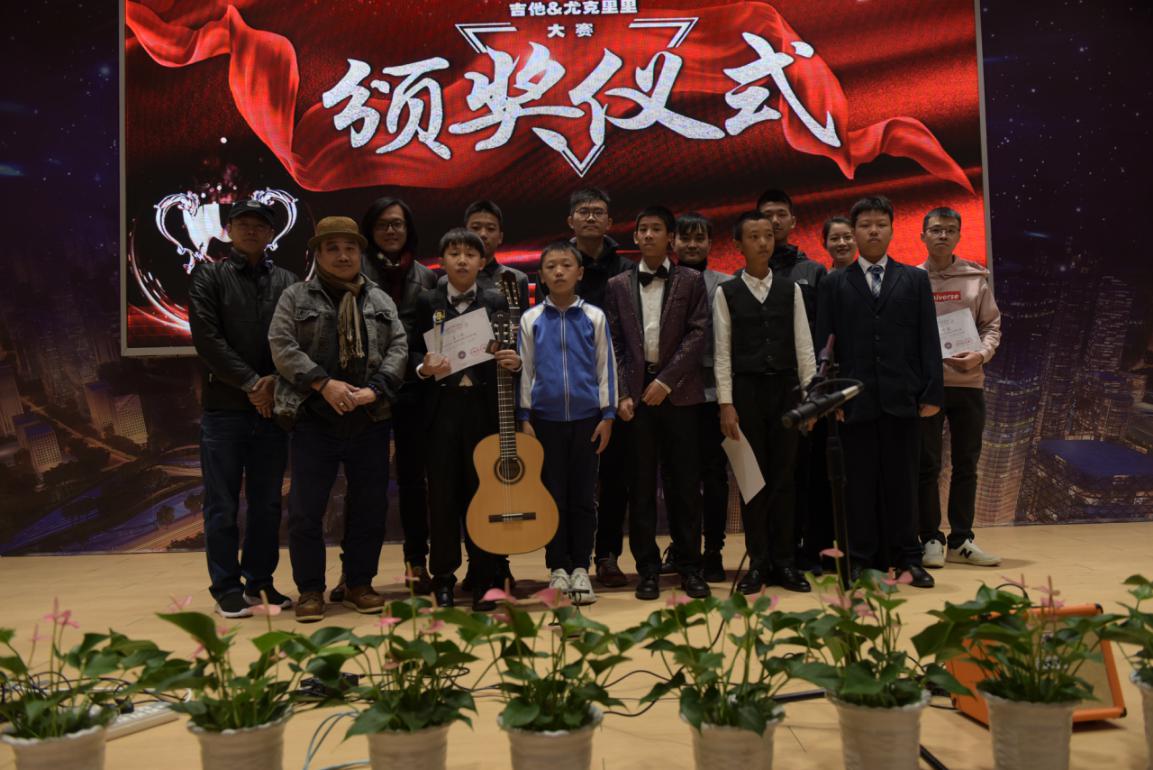 圖:指彈尤克里里組獲獎(jiǎng)選手與評(píng)委嘉賓合影