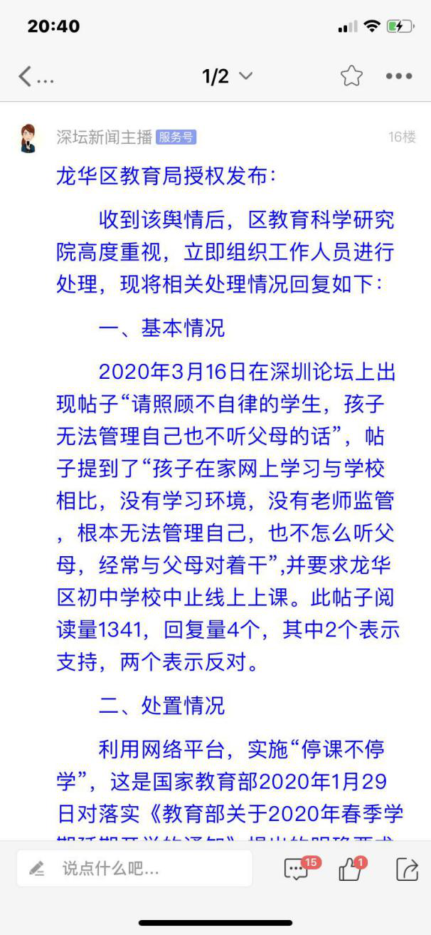 3月16日,有市民在深圳論壇發(fā)帖《請照顧不自律學生,孩子無法管理自己也不聽父母的話》,稱因自己要上班,孩子在家無法自律自覺上網(wǎng)課,學習效率低。上課期間玩游戲,不拿課本出來,看課外書、玩小東西、在電腦上畫畫等等;而老師布置的網(wǎng)上作業(yè),根本不想做,家長反復催后或亂做。自己咨詢過眼科醫(yī)生,表示因為上網(wǎng)課要長時間面對電腦、平板等電子設備,對孩子眼睛傷害比較大大。特此希望龍華區(qū)教育局可以考慮終止初中的網(wǎng)課。
