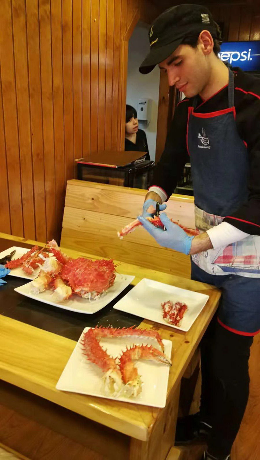 蜘蛛蟹(又名皇帝蟹)只產(chǎn)于南北兩極冰冷的海洋中,大個(gè)的重量可達(dá)5公斤以上。資深旅游者大多知道美國阿拉斯加的蜘蛛蟹是當(dāng)?shù)靥禺a(chǎn)美味,但很多人并不了解智利、阿根廷接近南極洲的海域有比阿拉斯加蜘蛛蟹更大、味道更好、價(jià)格更低的同類海產(chǎn)品。李仁奇攝