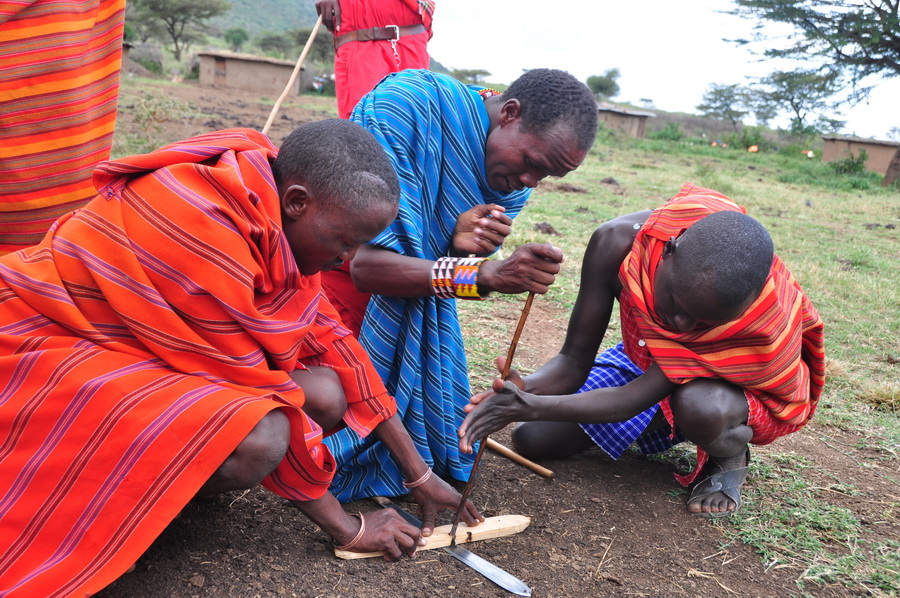 馬賽人盛行一夫多妻制。成年男子蓄發(fā)編成小辮,年輕婦女剃光頭。近年來(lái),定居的馬賽兒童開(kāi)始上學(xué),已出現(xiàn)少數(shù)馬賽人知識(shí)分子。圖為為游客表演鉆木取火等節(jié)目的馬賽人。李仁奇 攝