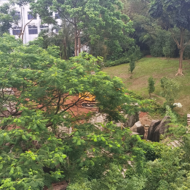 其次,從今年7月起,在二層架高平臺(tái)之上的山坡綠地,存在樹(shù)木砍伐和綠地草坪遭毀壞的情況,且有挖掘機(jī)開(kāi)入并停泊,而現(xiàn)場(chǎng)也沒(méi)有任何工程信息和告示。